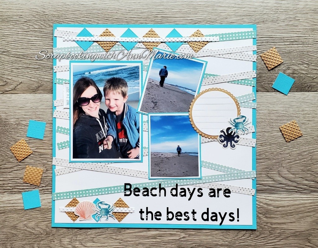 After moving things around (a lot!) this is my finished page. I criss crossed my strips and added my squares as borders. I dressed it up a bit by adding embellishments, a title and a journaling spot for the story.